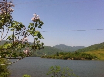 莲花峰的道路七湾八绕,如一条舞动的飘带,右边青山起伏,时而是万竿翠竹,时而是郁郁青松:左边是深邃的库谷,水面波平如镜,映出对岸层叠的山峦,做了爱俏的青山的梳妆台。山谷里偶尔飘来一丝风,在平滑的水面上漾起极细的鱼鳞纹,一层一层地抖开,抹乱了青山的俏脸。