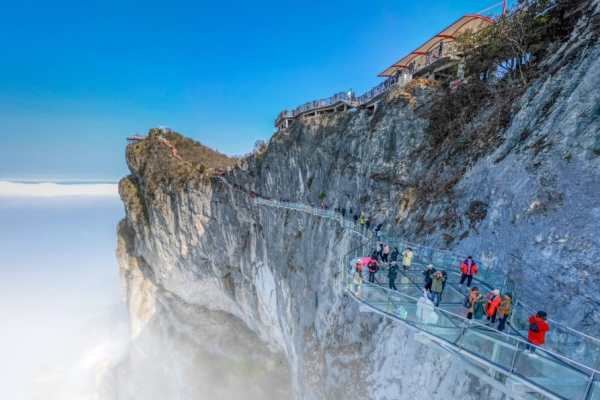 该区域以险峻地形著称,设有绝壁栈道、天梯等户外运动线路。2018年启动旅游开发,2020年开建七星索道(全长2003米,垂直落差708米,最大坡度42.79度,每小时载客量2000人次),2022年1月正式对外开放。2023年建成高空玻璃栈道(海拔1314米,长199.99米,总投资1700万元),同年运营湘西北唯一高山滑雪场并连续举办两届冰雪旅游节。配套建设天界小镇商业街区及揽月湖周边民宿群,2024年11月建成亚洲最长飞拉达攀岩线路(1500米)并开放。